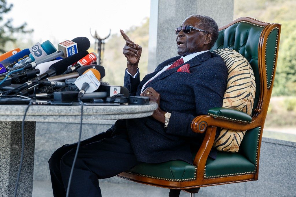 In this photo taken in 2018, Zimbabwe’s former President Robert Mugabe speaks during a press conference held at his “Blue Roof” residence, in Harare. Photo by AFP